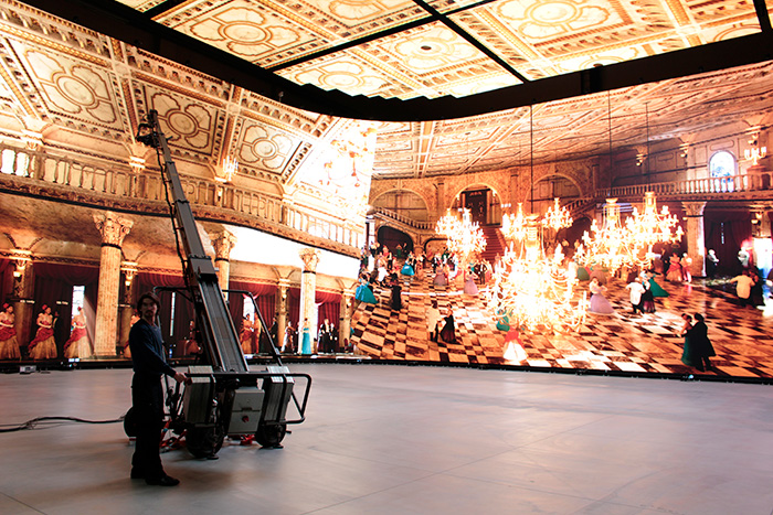 撮影シーンの背景をLEDが敷き詰められた壁に映し出し、その映像と現実の被写体(アクターや小道具など)を組み合わせて撮影する最新の映像制作技術。撮影カメラの位置やレンズの視野角の動きをリアルタイムで追跡(カメラトラッキング)し、その視点に合わせて背景のCG映像を瞬時に変化させる。